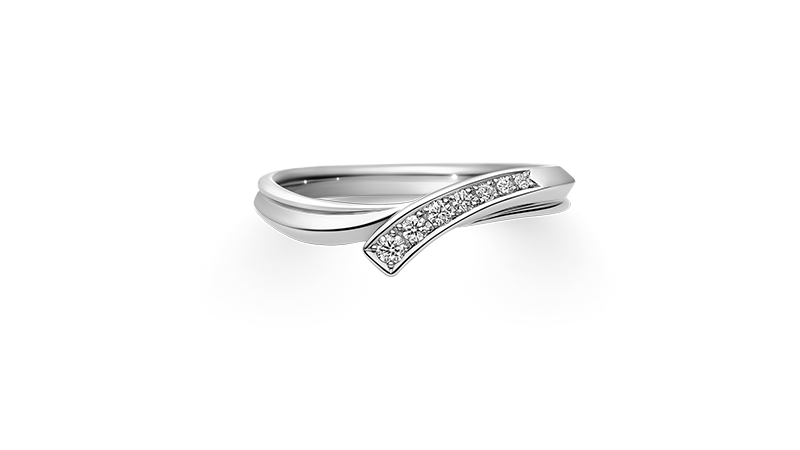 在设计的巧思下,曼妙弧度紧裹着7颗渐变排列的配钻,在指间舒展蔓延,沿着轮廓隐约泛出的金属色泽,与钻石光芒一同指引着我们走向幸福未来。