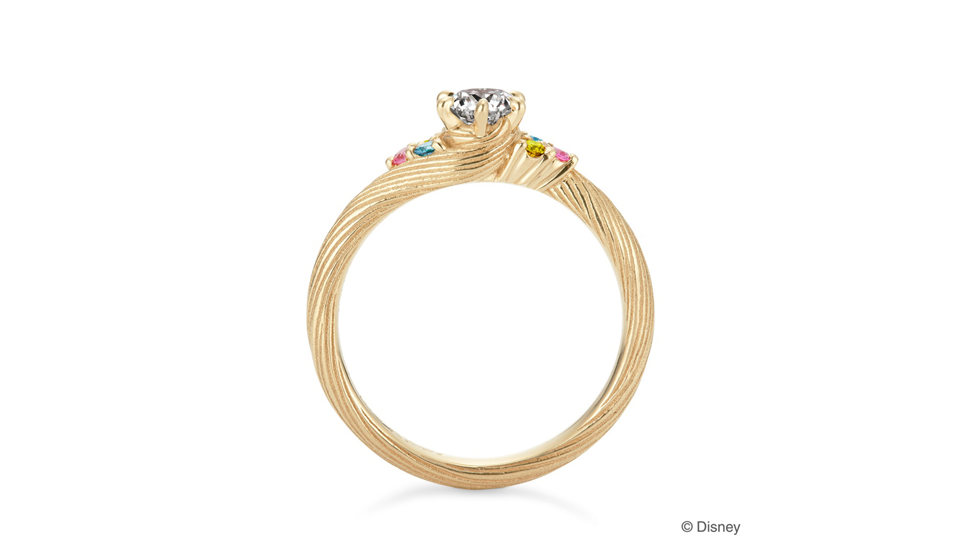 以发丝为主题,设计出美丽的细腻质感。3种宝石色调令人联想到电影的情境,且让手指倍显华丽。钻石下方的戒指内侧另刻有太阳图纹。
