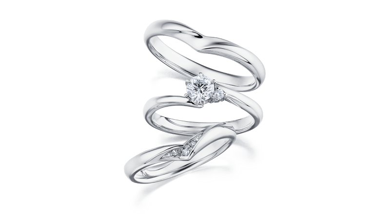 简洁的V字线条令人印象深刻。主钻旁添加配钻,为华丽高雅的形象加分。重叠佩戴更显典雅气质。