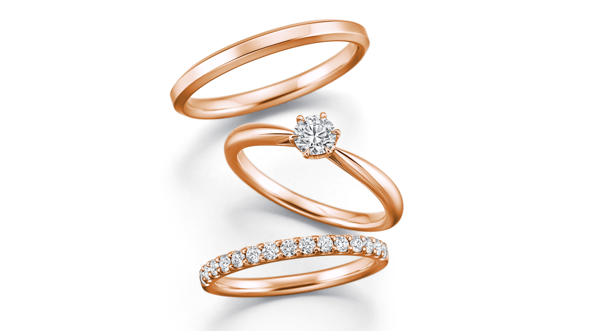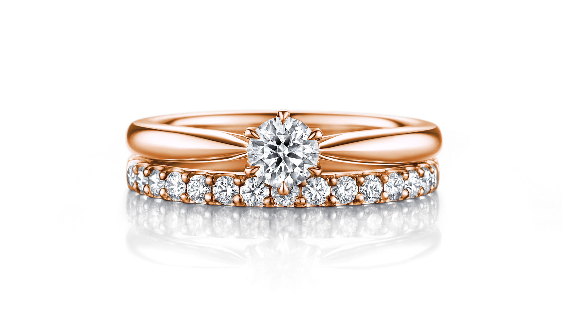 耀眼的单颗美钻订婚钻戒Altair搭配利落简洁的排钻直线结婚对戒Vestalis,是都会风尚佳偶的选择。