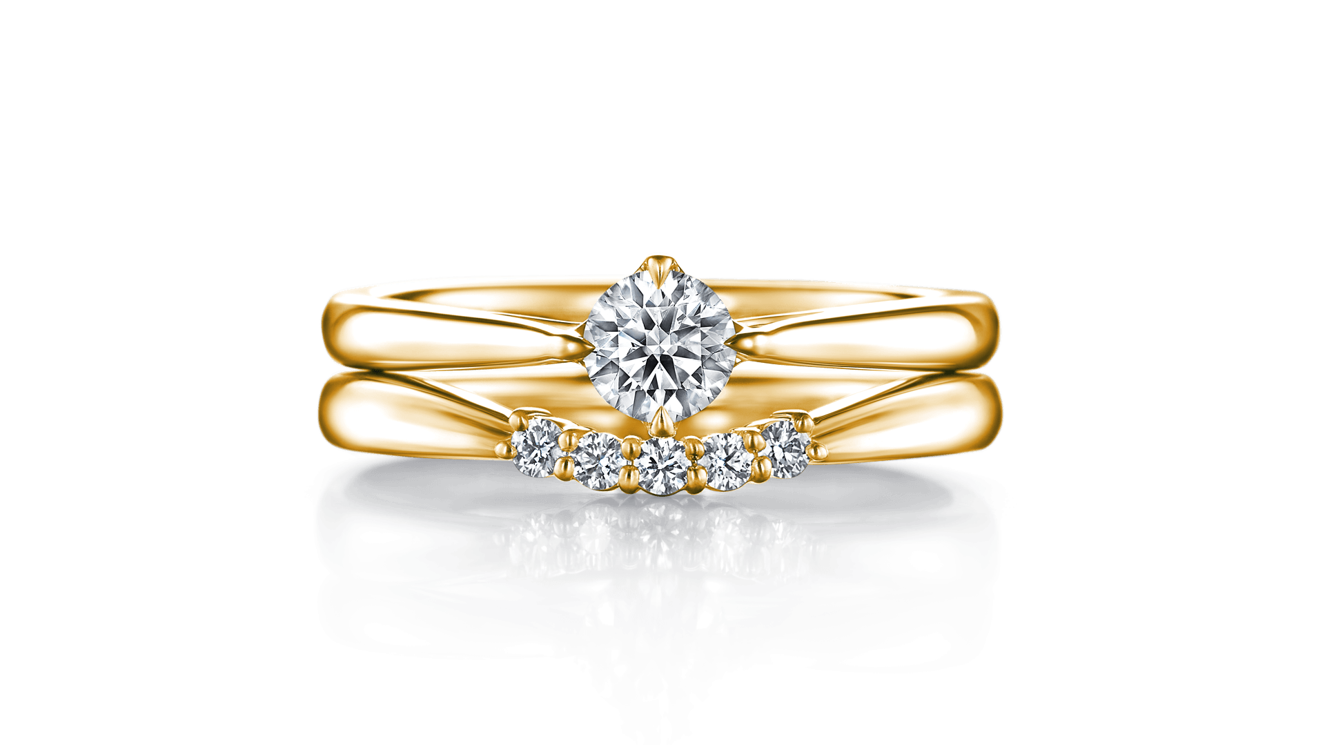 宛如一等星般光彩夺目的主钻,在五颗配钻绕成的可爱曲线衬托之下,使套戒更显华丽璀璨。设计精致洗炼,散发纯洁光辉。