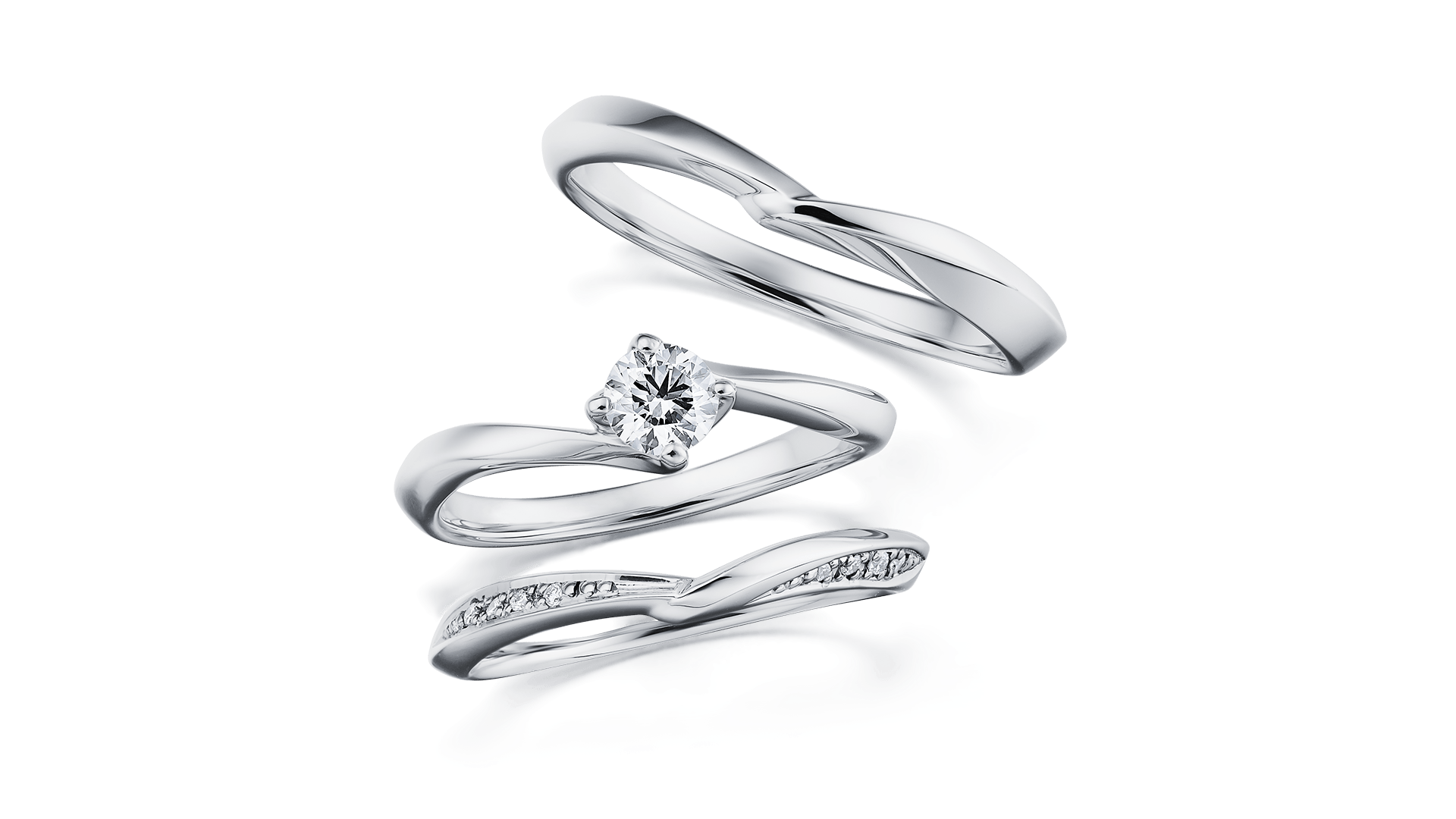 线条优美的戒环与外缘稜角设计的波浪型结婚对戒搭配成套。订婚钻戒的主钻夺目绚丽,搭配简洁的结婚对戒,更显奢华。