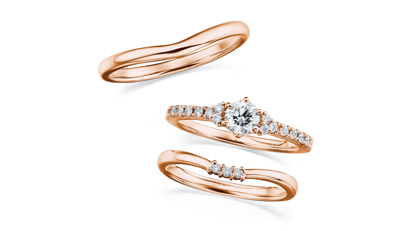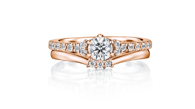 绽放华丽细緻光芒的订婚钻戒,搭配简洁高雅线条的结婚对戒。结婚对戒的配钻,象徵山谷间飞舞的精灵对两人结为连理的祝福。这份祝福在指尖闪耀。