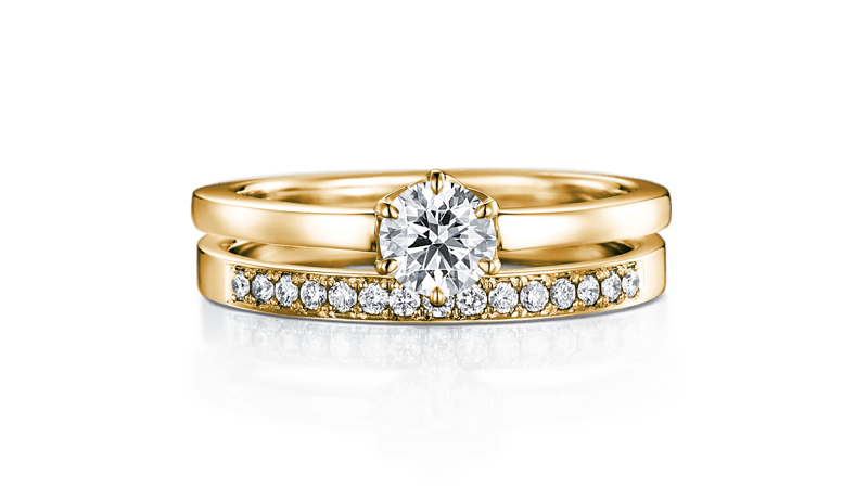 订婚钻戒展现隐藏于纤细中的坚强;结婚对戒带给人简洁却华丽的印象。适合成熟大人佩戴的简约时尚组合。