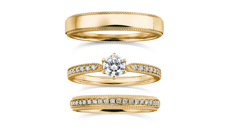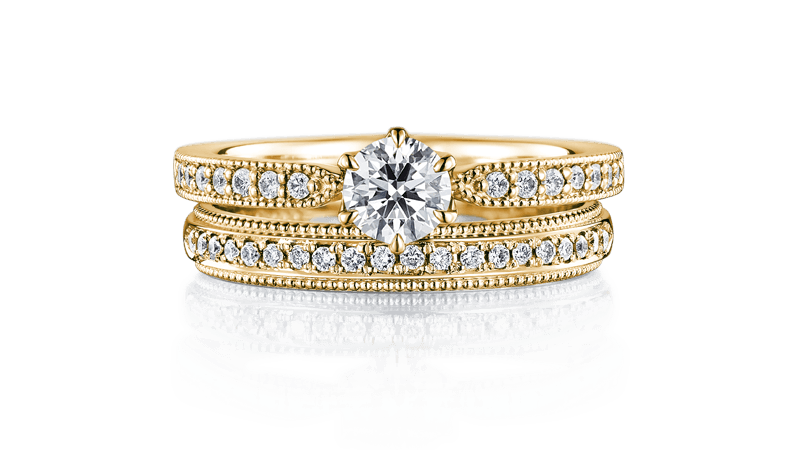 高雅的古董风设计,细緻的密钉镶滚珠边和闪亮的配钻为其特色。环绕整圈的美丽滚边,象徵两人永恒不变的约定。