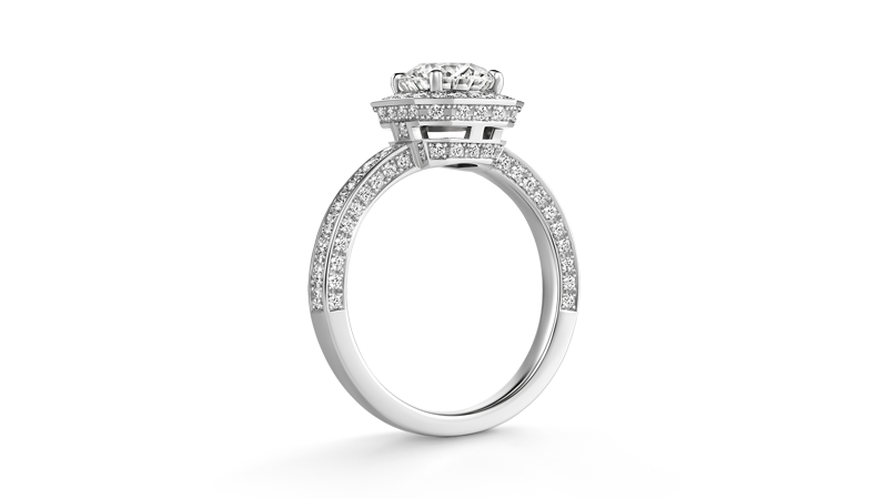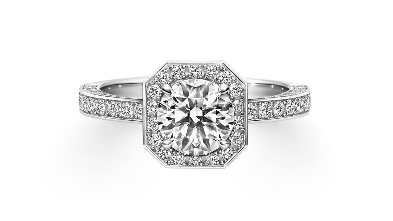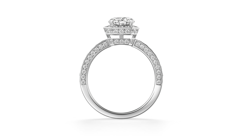 以大量钻石打造凝聚结构之美的订婚戒指。