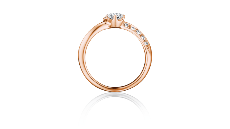 以GEMINI(双子星)为设计概念,中央主钻旁依偎著粉红配钻。优雅S型戒环佈满丰富的配钻,更显华丽美感。