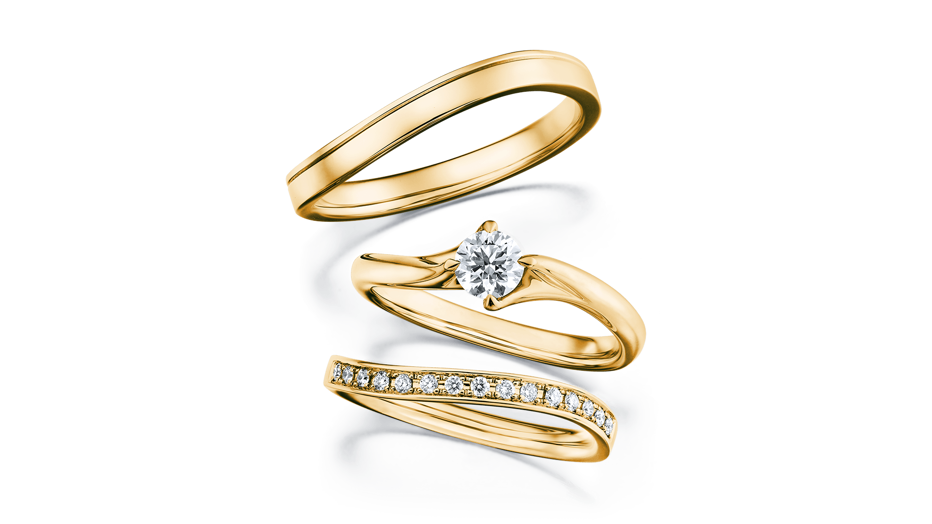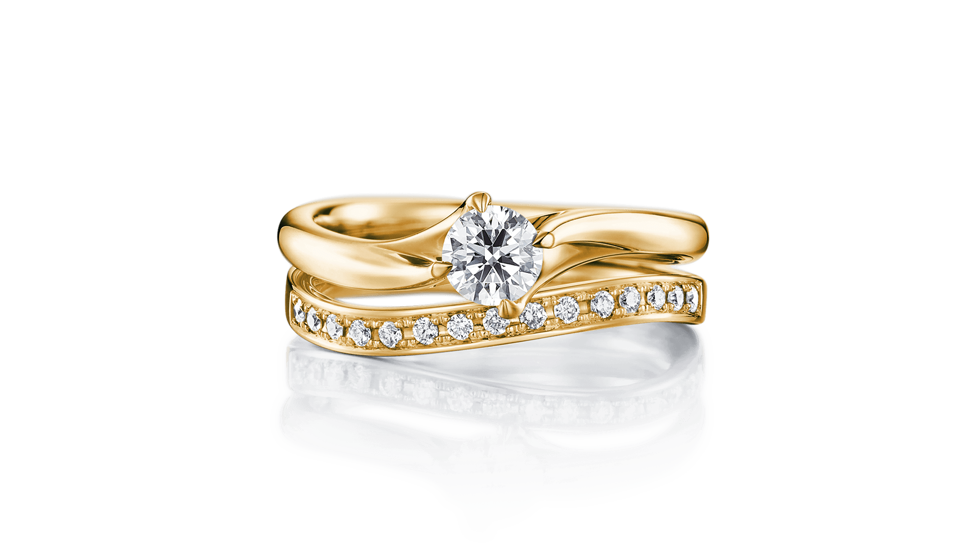 以铺满碎钻的线条展现奢华感的結婚戒指「TRITONE」,搭配设计简洁的订婚戒指,给人成熟的印象。是组闪耀着时尚光芒的套戒。