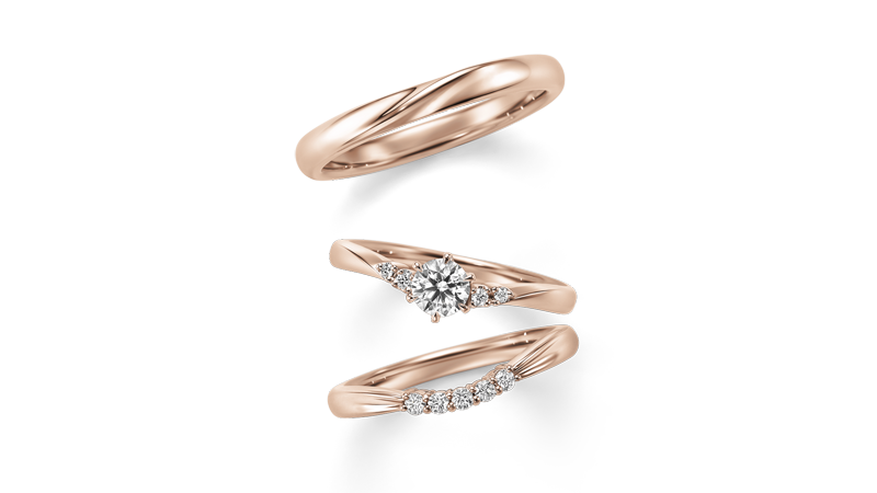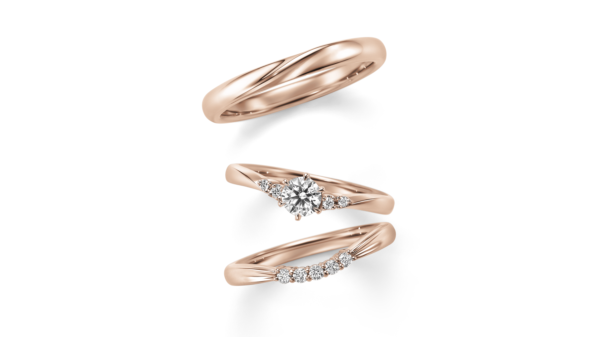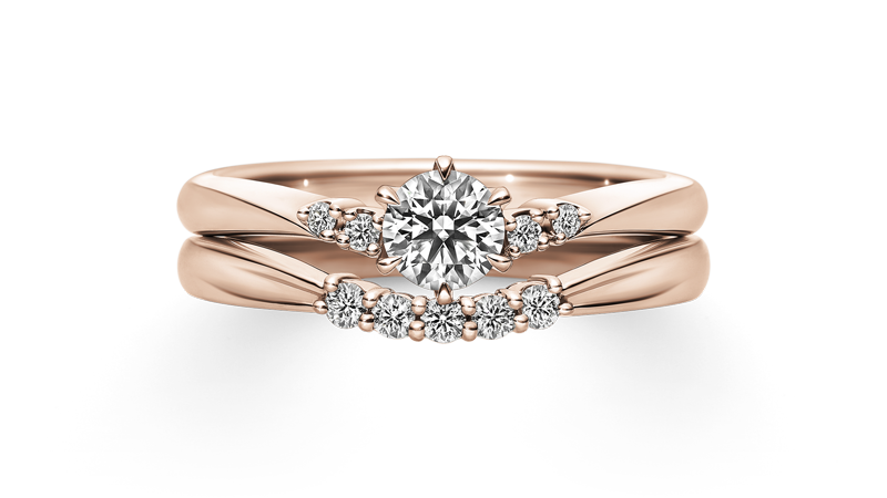 犹如女神的衣服和丝带般排列的可爱配钻,从戒台两旁照射而来的光线在柔和线条的V型中央聚拢。