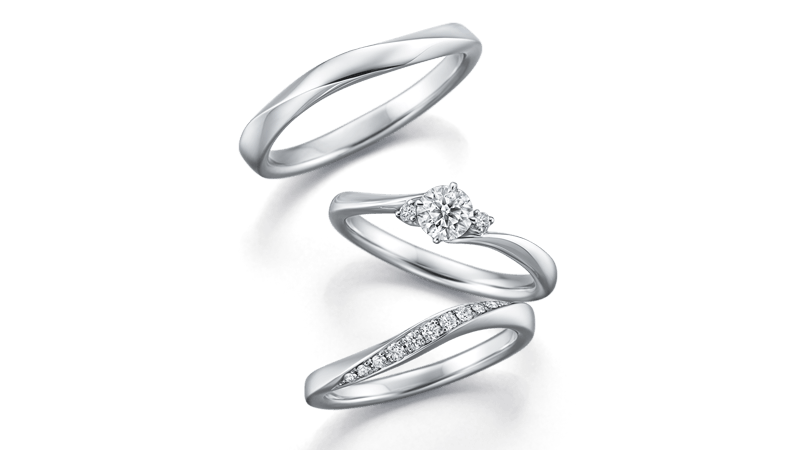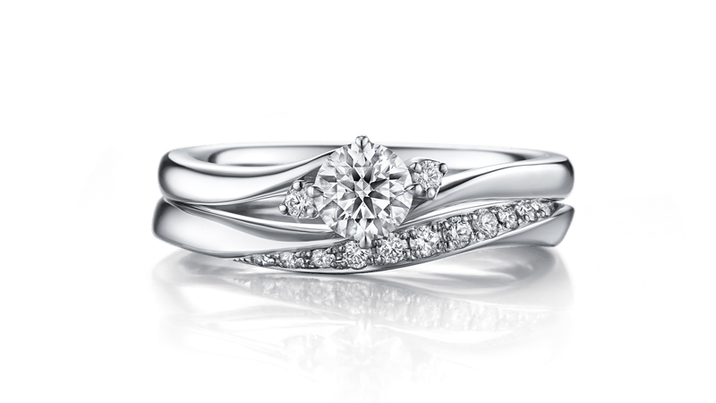 高雅的订婚钻戒Kitalpha与柔美的结婚对戒Alcestis,戒环滑顺的线条更越显指尖优美,如同新娘的幸福光晕也因钻石的波光闪耀而更加明亮动人。