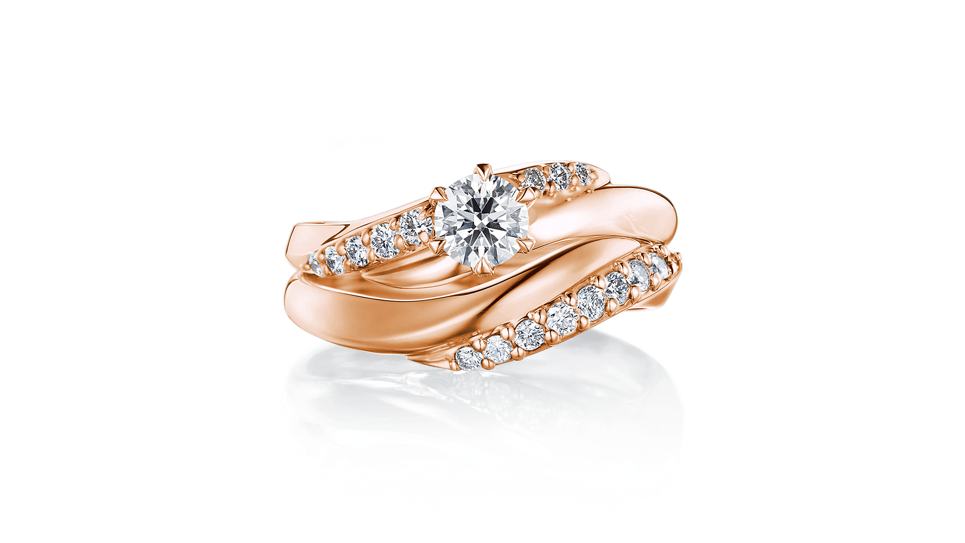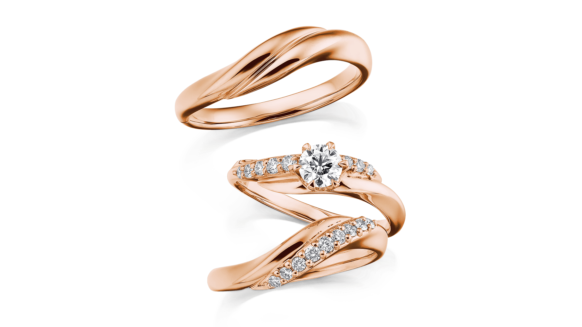 优雅S字型线条戒环的订婚钻戒与以同样波浪造型设计的结婚对戒。单独佩戴镶有丰富配钻的戒指显得高雅;成套佩戴时更显奢华风格。