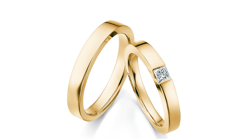 质感坚实的个性对戒。中央的公主型车工钻石给人时尚的印象。
