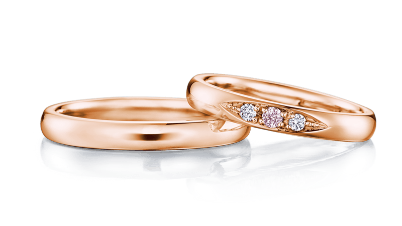 隽永的经典结婚对戒。中间有一颗粉红钻石,两侧则各镶有一颗白色钻石做为设计,以海神为名,辽阔地守护两人的爱。