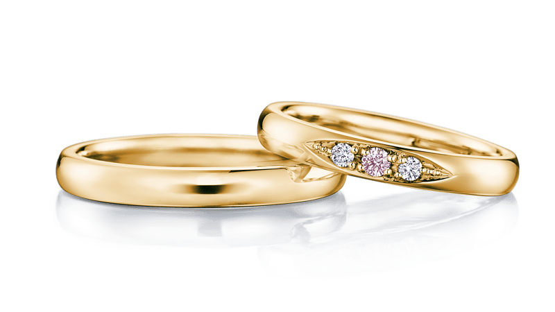 隽永的经典结婚对戒。中间有一颗粉红钻石,两侧则各镶有一颗白色钻石做为设计,以海神为名,辽阔地守护两人的爱。