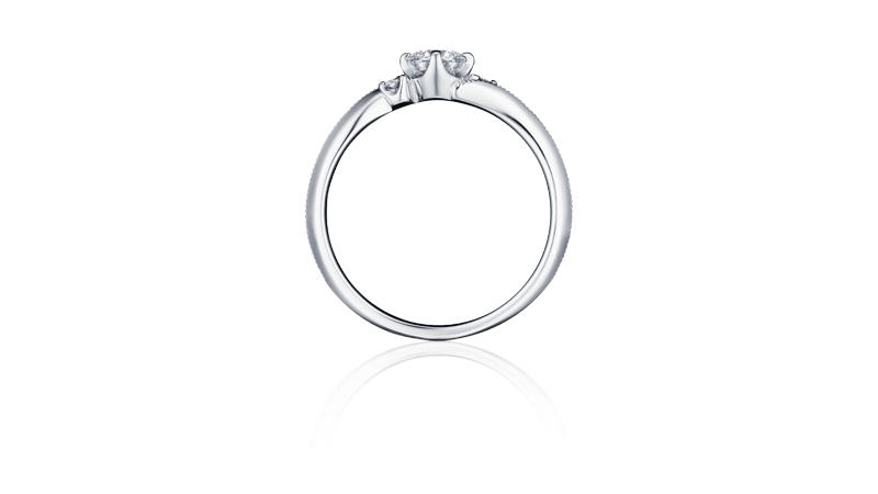 细致的心型密钉镶滚边闪亮耀眼的结婚套戒。订婚钻戒和结婚对戒的线条结合,可爱地依偎在主钻旁的配钻,让手指显得更加美丽。