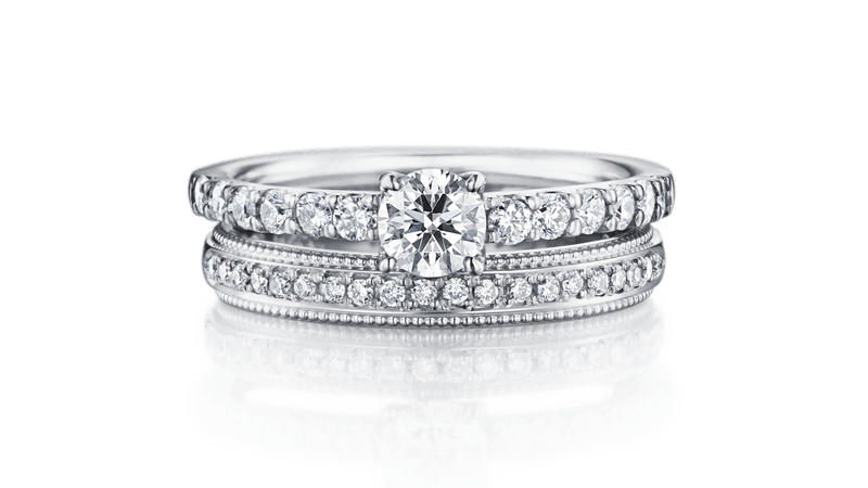直线俐落的戒指组合衬托出钻石的璀璨。