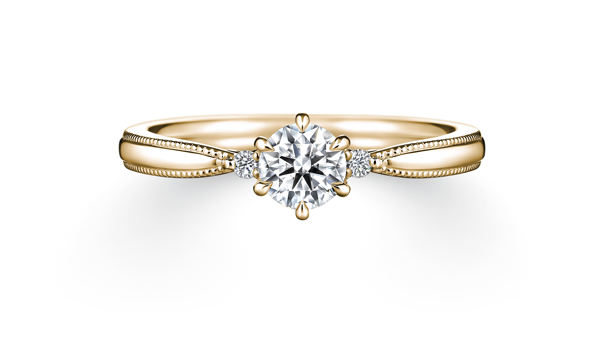 这款订婚钻戒的灵感来自夜空中格外耀眼的昴宿星团。两侧的滚珠装饰,宛如点点繁星绽放雅致光辉。从侧边观赏时,能发现隐藏的爱心设计。大量运用镂空工艺,打造出剔透轻盈的造型。考虑到与结婚对戒叠戴的效果,仅于单侧镶嵌小颗美钻。设计洋溢着浪漫气息,从任何角度都显得典雅优美。