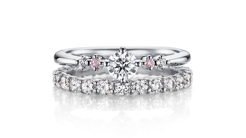 可爱的订婚钻戒「TWINKLE」,粉红色和白色的异色配钻闪闪发光。与玫瑰金的永恒之戒「MANI」搭配,成为华丽又浪漫的组合。