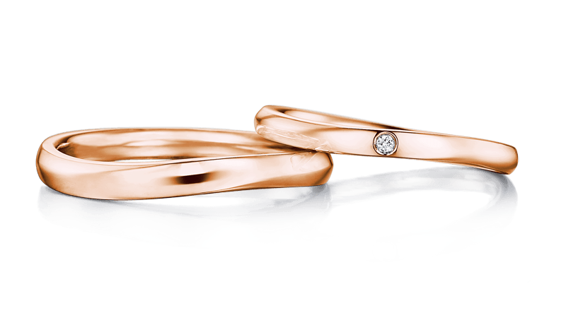 时尚的波浪型对戒。纤细而闪耀的修边,与焦点配置的钻石营造出优雅风格。