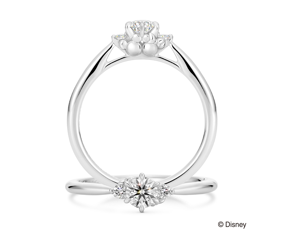 正面角度造型简单利落。两颗配钻依偎着主钻,为戒指增添惹人怜爱的印象。“米奇”与“米妮”设计成圆滚滚的立体形状,可爱到让人无法移开视线。