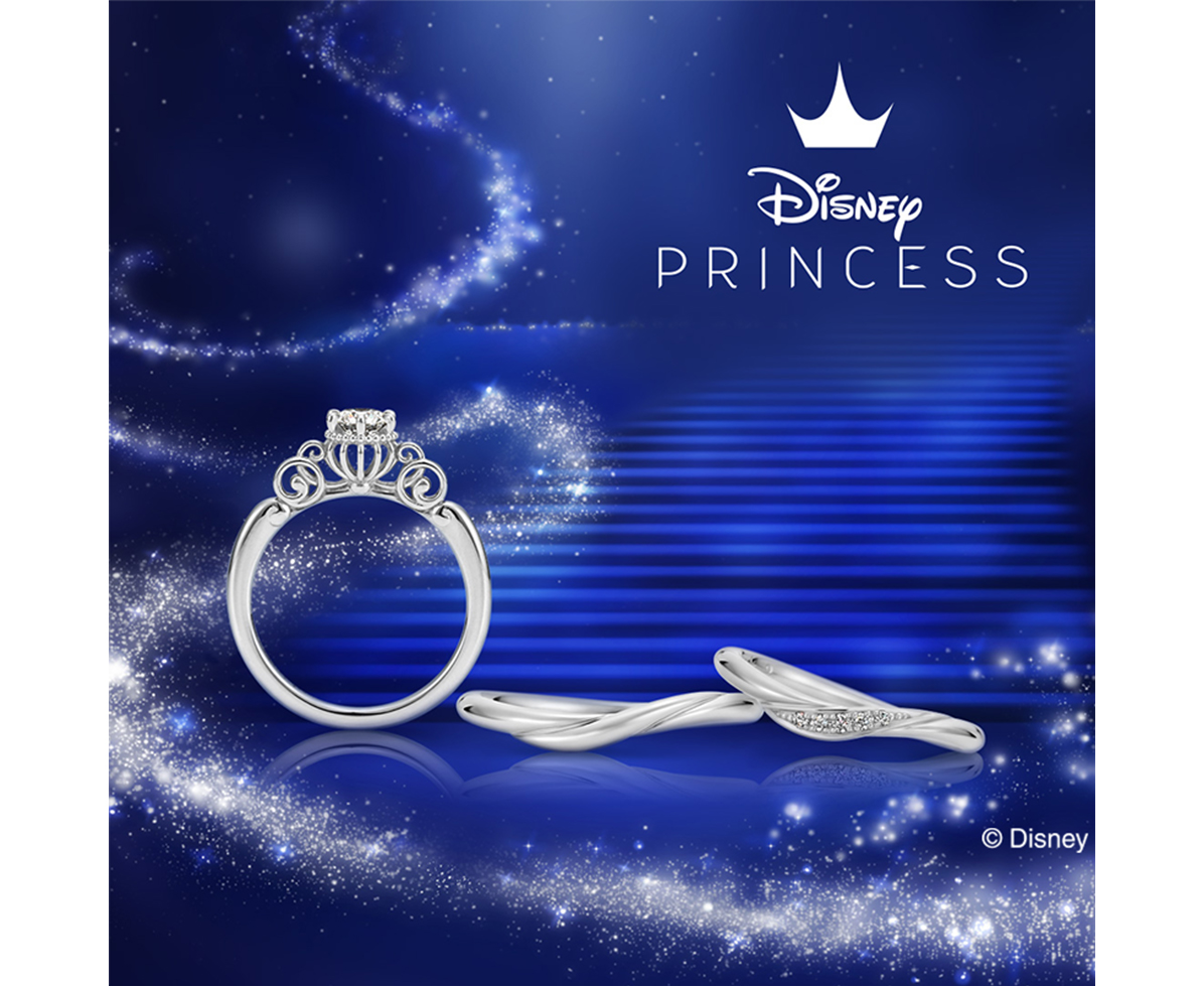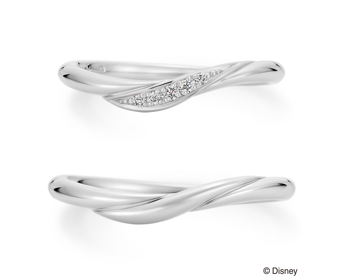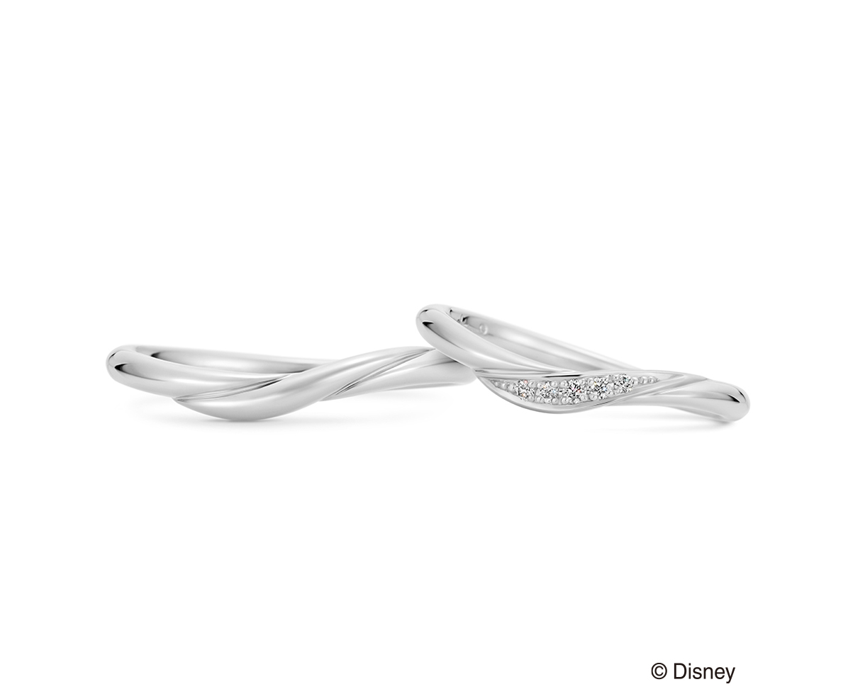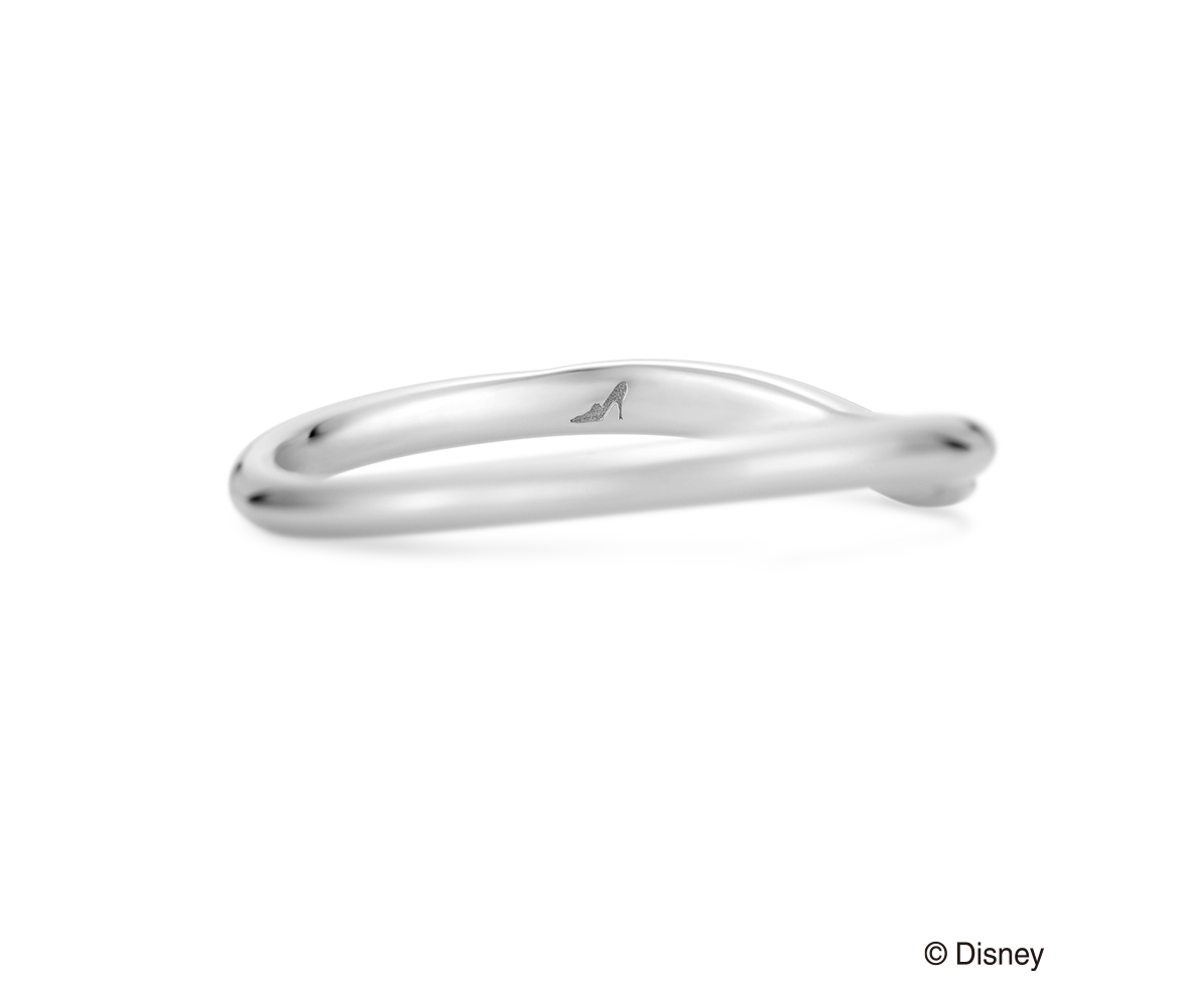 纤细柔美的波浪线条,让两人的手指展现出柔和而高雅的印象。成对造型的男女戒亦是其特色所在。戒环为窄版设计,能佩戴出利落风格。戒指内侧藏有牵起灰姑娘与王子缘分的玻璃鞋图案,低调的设计恰似两人的秘密。