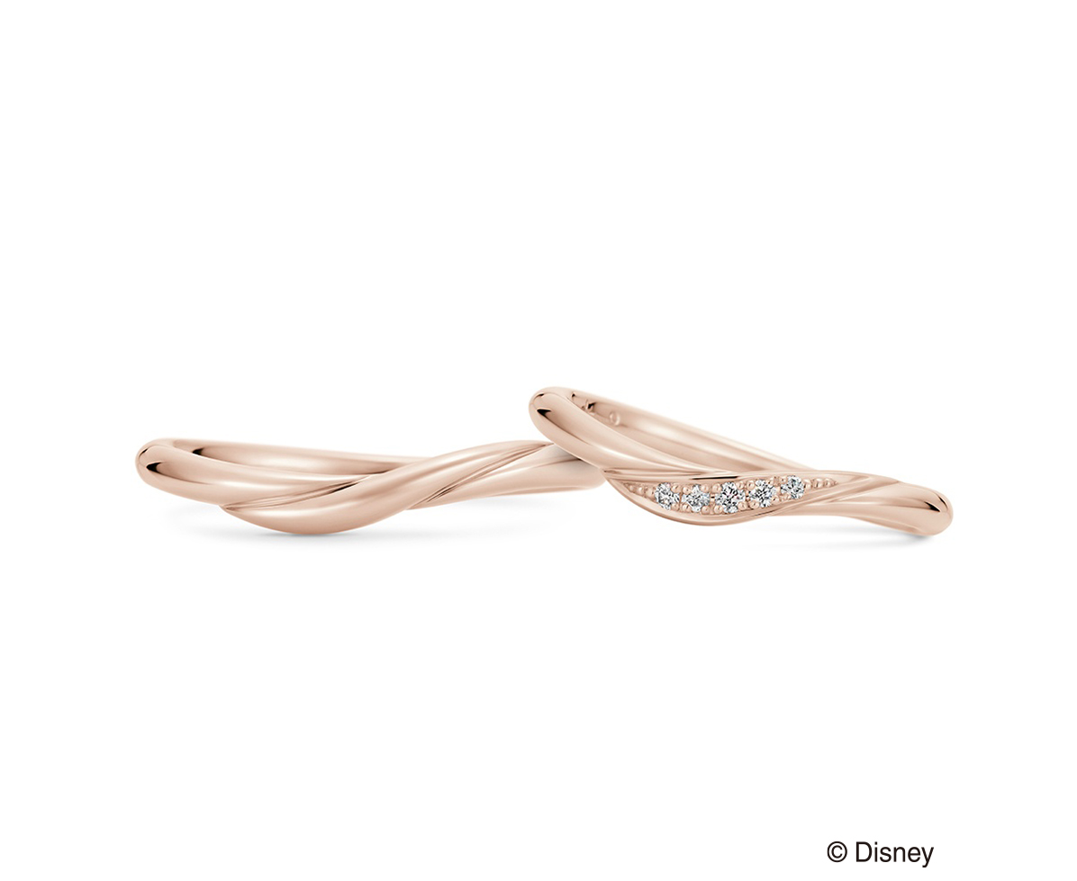 纤细柔美的波浪线条,让两人的手指展现出柔和而高雅的印象。成对造型的男女戒亦是其特色所在。戒环为窄版设计,能佩戴出利落风格。戒指内侧藏有牵起灰姑娘与王子缘分的玻璃鞋图案,低调的设计恰似两人的秘密。
