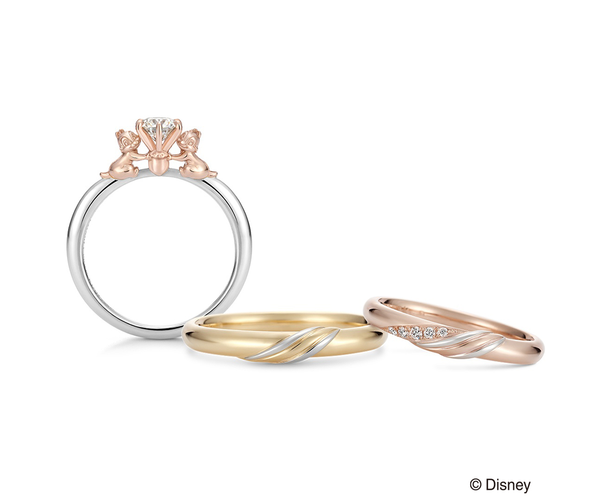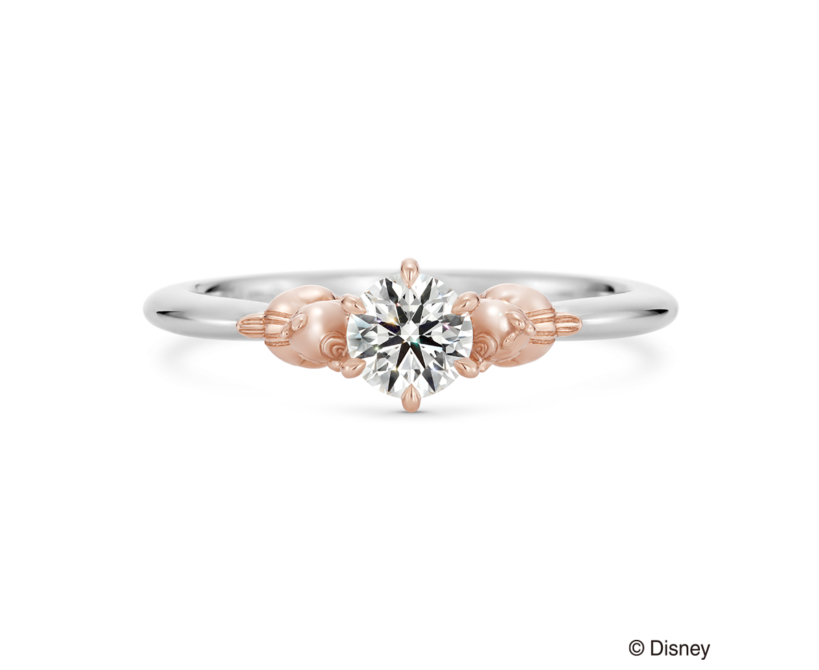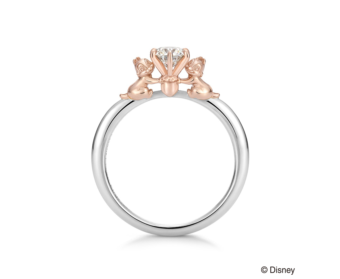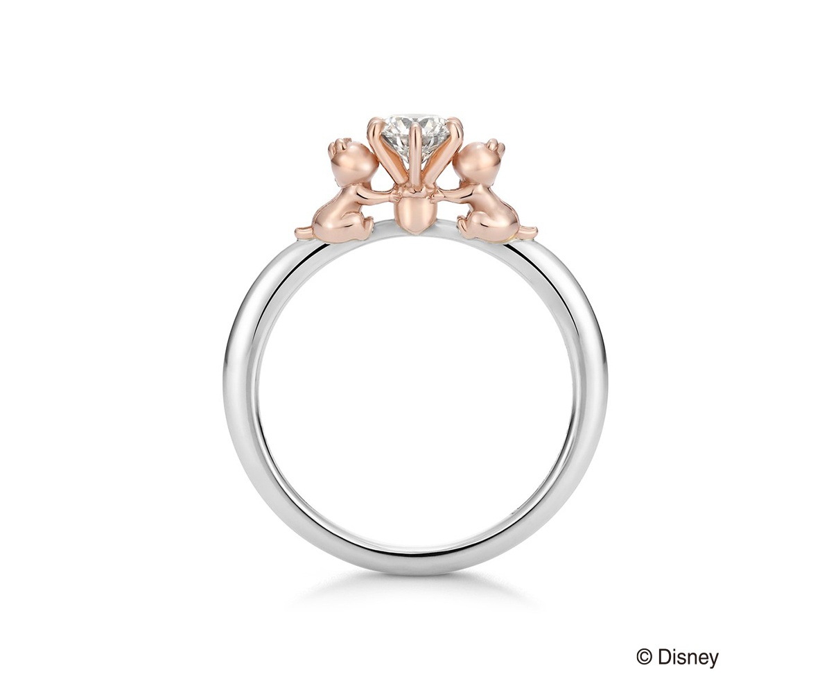 以团队合作极佳的顽皮组合“奇奇蒂蒂”为主题,脸部细致刻划展开笑颜,仿佛祝福着充满无限光辉的未来。戒台特别设计成“奇奇蒂蒂”最爱的橡果,突显两伙伴小心翼翼将钻石捧于手心的可爱模样。