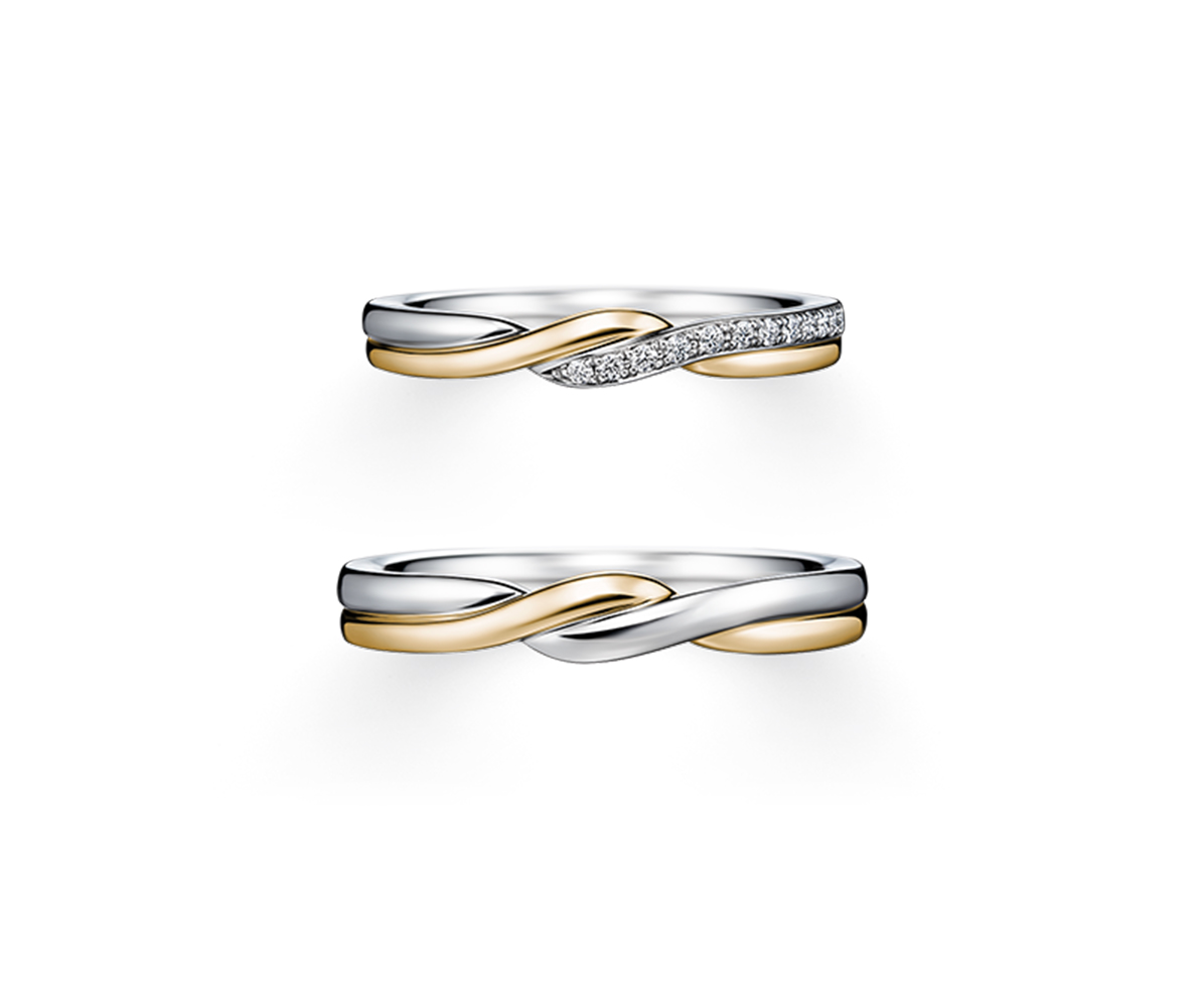 配钻与黄金线条互相交错的戒指,赋予指间优美魅力; 戒指厚实有分量,展现不容忽视的存在感。 直线型戒环上令人印象深刻的扭转造型与双色设计, 在手上散发高雅气质,祝福展开新生活的两人。