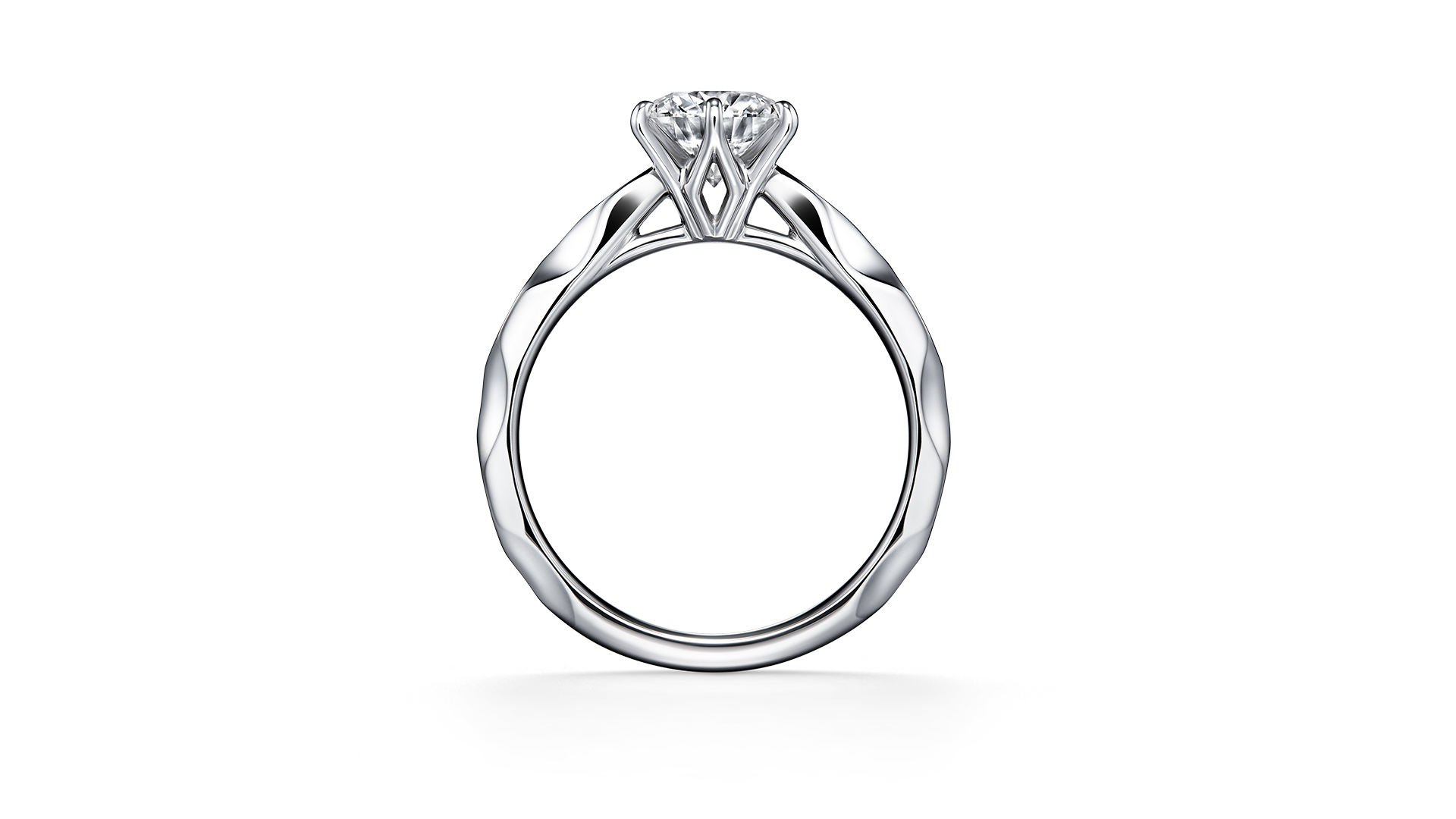 以描述优美涟漪的季语为主题,为纤细戒环赋予具生命力的纹理。 点缀侧视角度的菱形空间也会照入光线,使钻石绽放细致光芒。 宛如阳光下闪耀的河流,献给珍惜安稳幸福时光的两人。