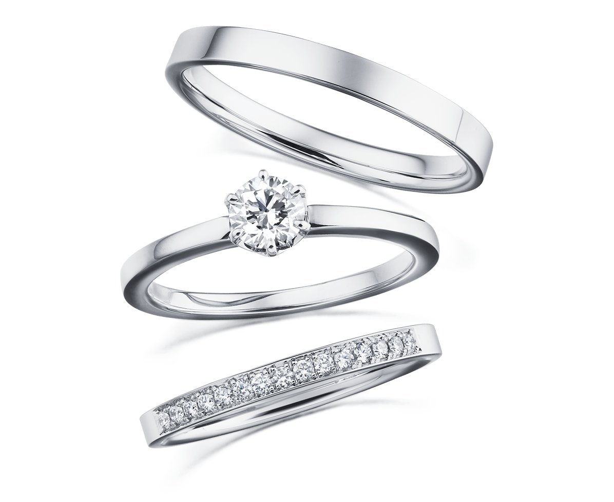 订婚钻戒展现隐藏于纤细中的坚强;结婚对戒带给人简洁却华丽的印象。适合成熟大人佩戴的简约时尚组合。