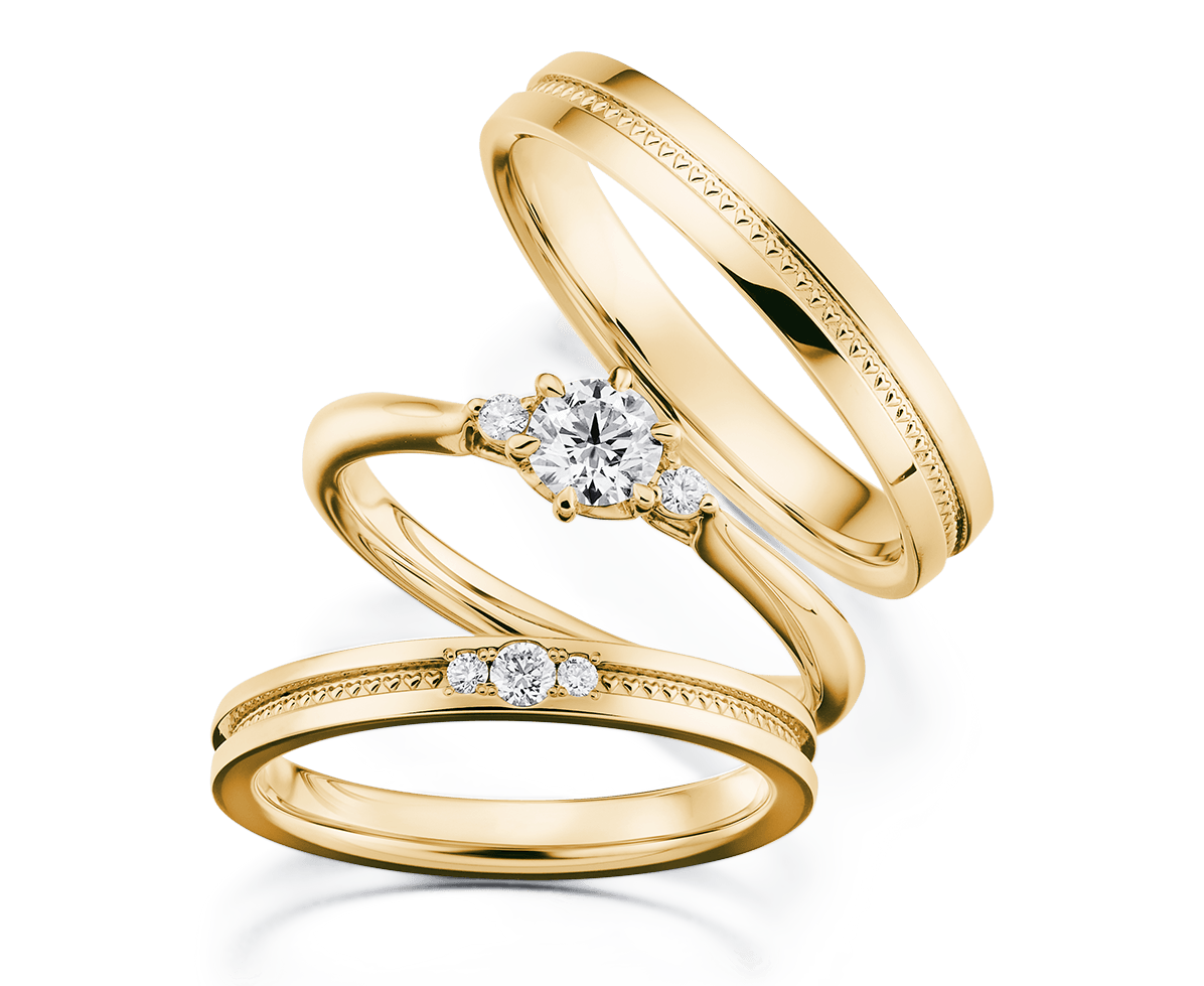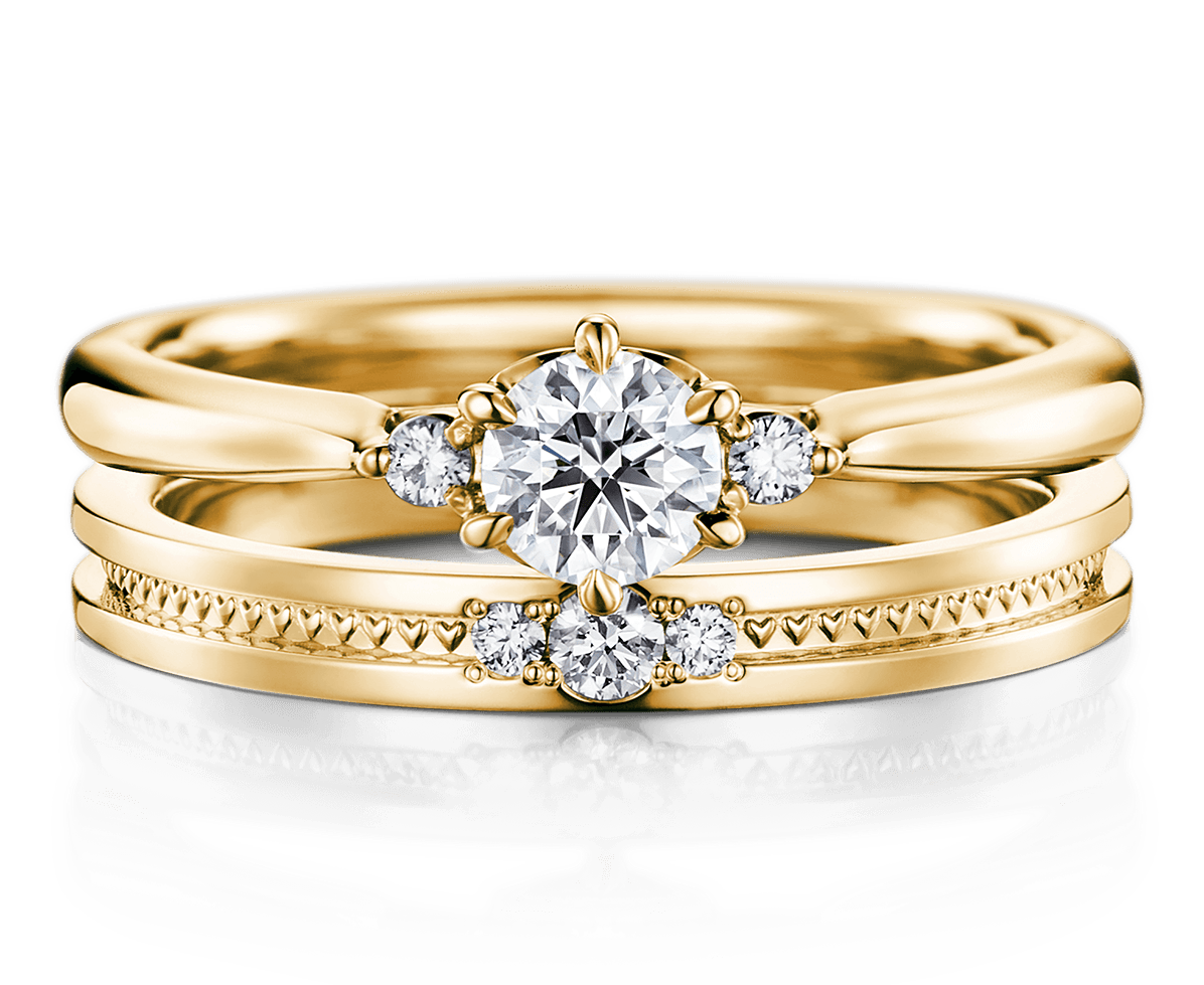 订婚钻戒的心型戒台,与结婚对戒的心型密钉镶滚珠边相连结。结婚对戒上绵延不绝的心型滚边,象徵永恒的爱恋。