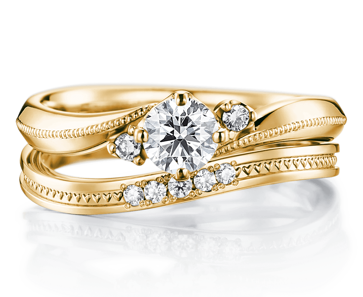 细致的心型密钉镶滚边闪亮耀眼的结婚套戒。订婚钻戒和结婚对戒的线条结合,可爱地依偎在主钻旁的配钻,让手指显得更加美丽。