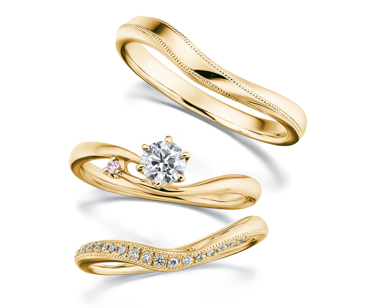 个性化的不对称设计,兼具简约与华丽的组合。结婚对戒的细致滚珠边,带给人古典高雅的印象。