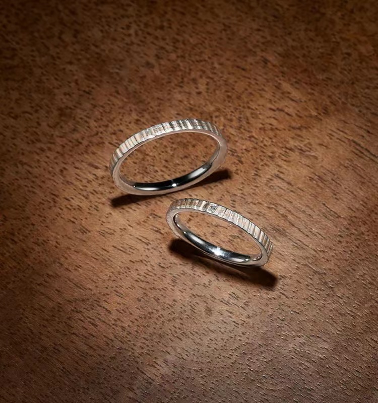 细密的发丝纹加工经过缎面处理,形成双重雾面加工,打造出有如丝绸纹路般的曼妙质感,使戒指带有柔和光泽和平滑触感。